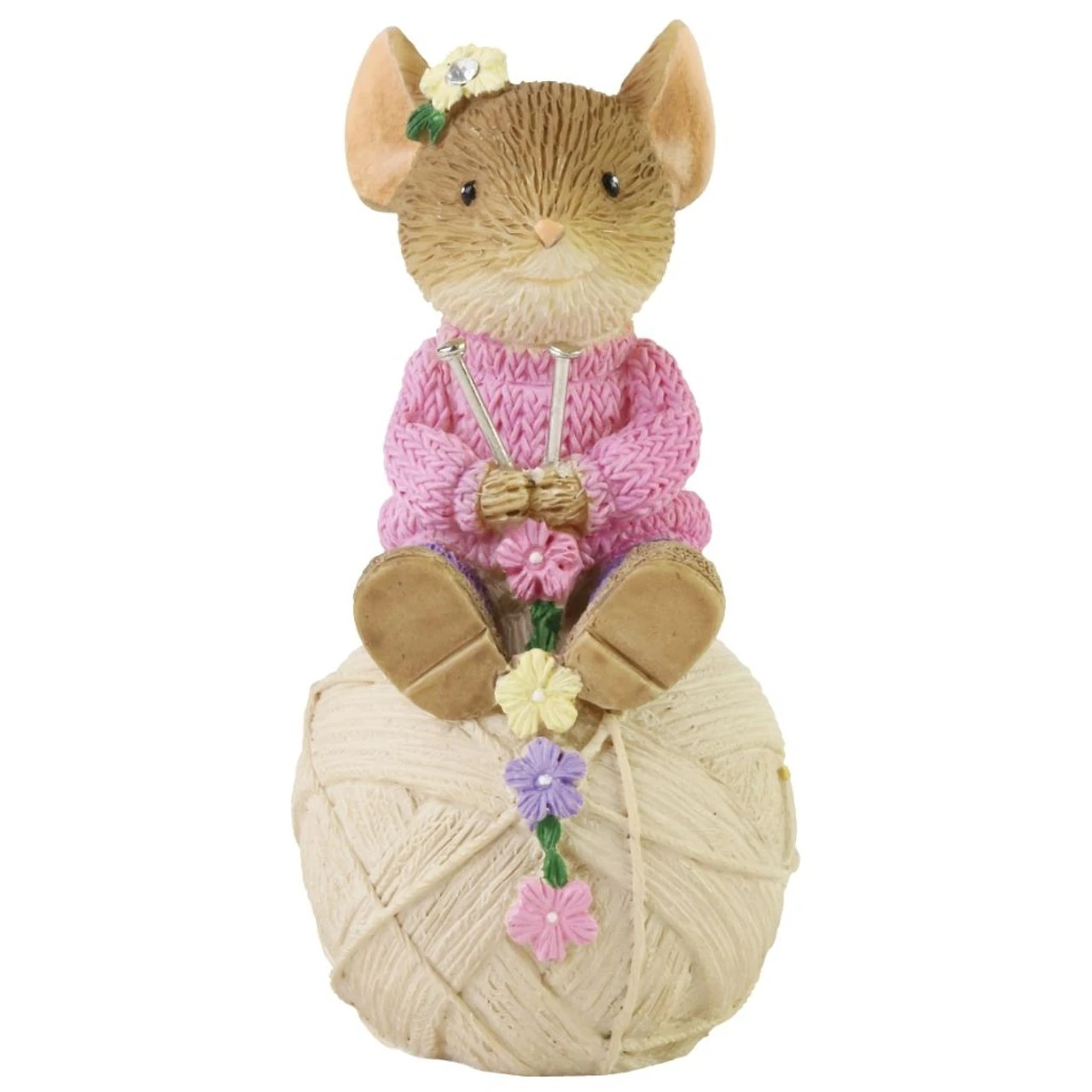 Sitting atop a ball of yarn, this crafty mouse knits herself a string of flowers. With one of her creations tucked behind her ear, she smiles sweetly imagining her next designs. Wearing a sweater and holding knitter’s needles, she’s ready to create.