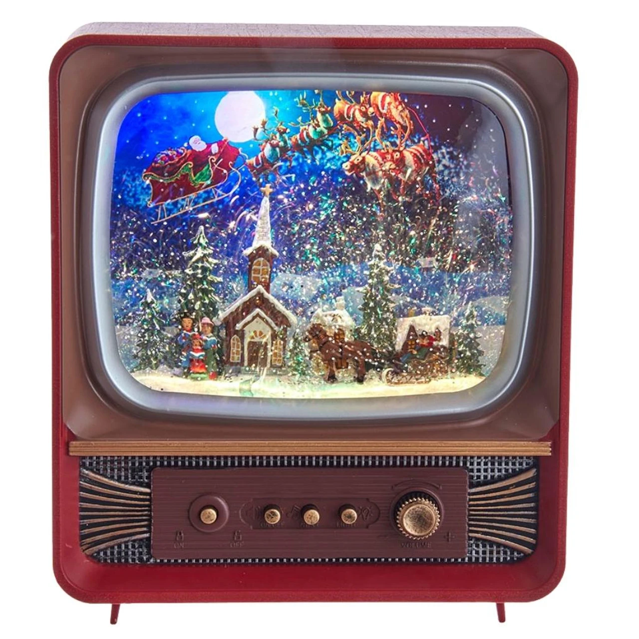 This 10-inch Battery-Operated Musical Santa Television with music from Kurt Adler is a charming addition to any holiday décor. This television water lantern features a vintage television with a screen that displays Santa in his toy-filled sleigh in a snowy Christmas village. When switched on it plays 8 different Christmas tunes. This water tree also includes a DC port and USB cable for ease of use.