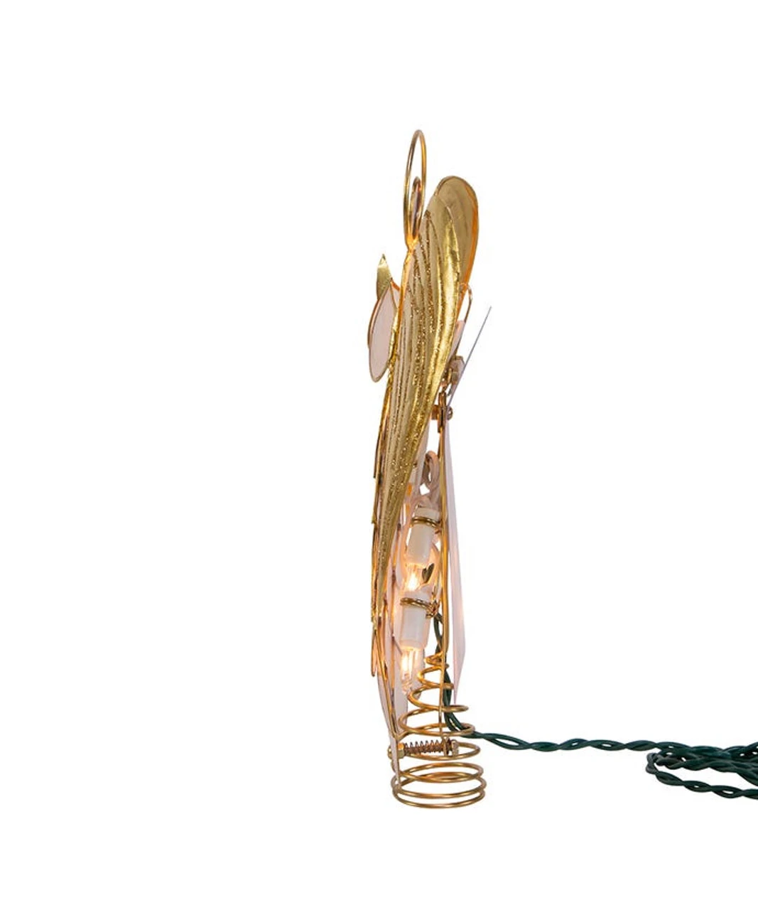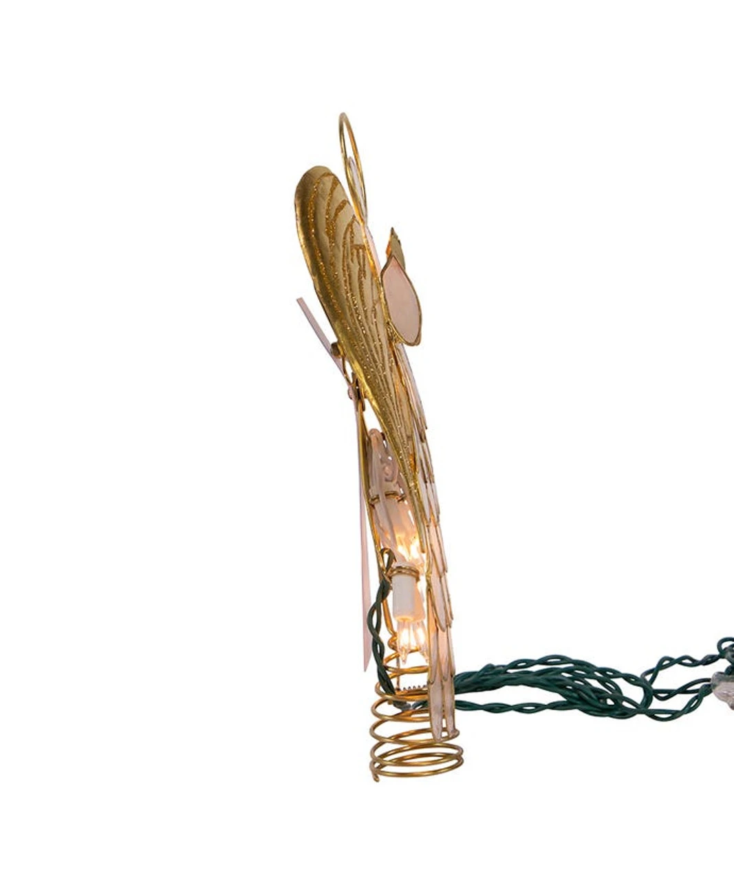 Complete your Christmas tree décor with Kurt Adler’s gold capiz angel treetop. Its beautiful design features capiz shell detailing with gold glitter trim and gold glittered wings. It sits atop a gold coil, which attaches securely to your tree.