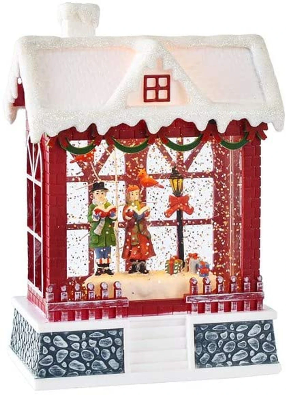 Carolers bundle up in their warmest clothes and gather on the street corner to sing songs of the season. Shaped like a house this adorable LED battery operated shimmer is a perfect addition to any holiday display. With neutral colors that work with most decor collections. Insert 3 AA Batteries (not included) and turn the switch to ON to see the inside light up with a warm glow and the glitter swirl around inside. Â