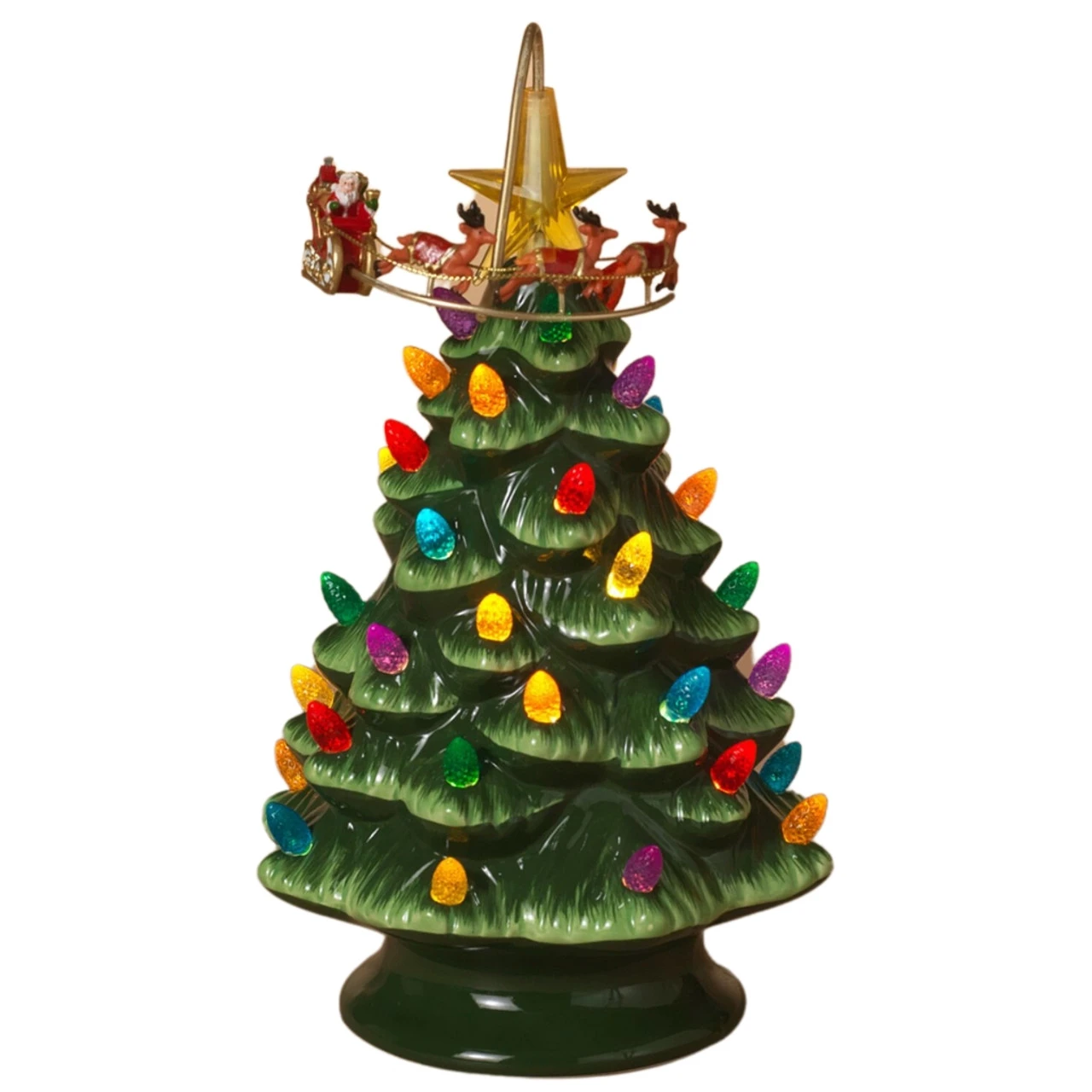 Experience the enchantment of the holiday season with our 10-inch Light Up Christmas Tree. Featuring a mesmerizing display of a lit-up tree with a rotating Santa and reindeer, it adds a festive touch to any space. Watch as Santa and his reindeer circle around the tree, creating a delightful spectacle. Crafted with attention to detail, this decoration is made to last. Perfect as a centerpiece or a gift, this charming Christmas tree brings joy and holiday cheer to your home.